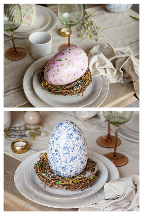 Velg mellom flere vakre mønstre: MARBLE 15 cm med et moderne, marmorert svart-hvitt uttrykk, VINTAGE 15 cm med et nostalgisk påskemotiv i blåtoner, CLASSIC 15 cm med søte påskeharer i tradisjonell stil, SPLASH 15 cm med et fargerikt og lekent regnbue-mønster, MARIUS 18 cm med det ikoniske strikkemønsteret til Marius-genseren og MAGNOLIA 15 cm i rosa med sommerfugl og vårblomster.