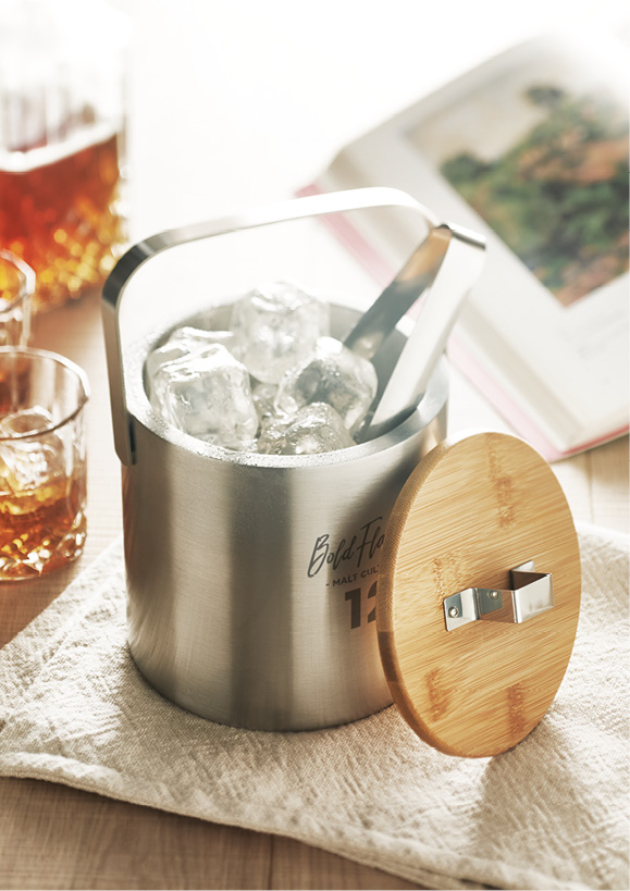 Settet fungerer godt både inne og ute og passer til alt fra barservering til møte- og eventbruk. Bøtten egner seg som profilprodukt for hoteller, restauranter, barer, events, konferanser og bedrifter som ønsker funksjonelle og representative serveringsartikler. Den store dekoren gjør produktet velegnet for grønn lasergravering på stålflaten.