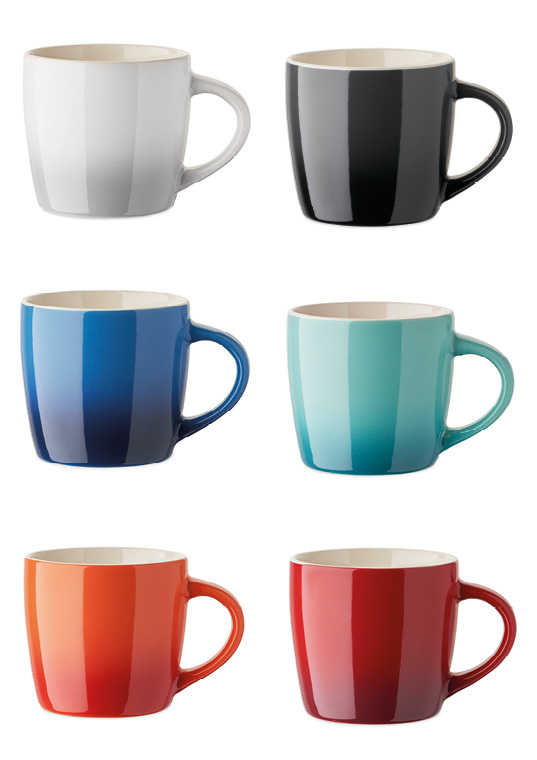 KERAMIKK KOPP GRADIENT 300ml kan merkes med ensfarget Rundtrykk, Tampotrykk i opptil 4 farger på øvre del, eller med keramisk transfer i opptil 8 farger på koppen og innsiden. Se KERAMISK KOPP GRADIENT 290ml med samme fargeutvalg, bare en litt annen modell.