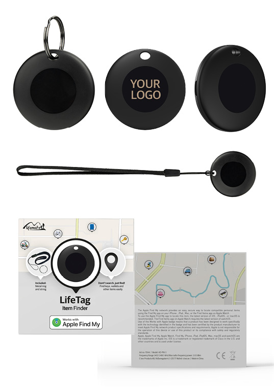 Materiale PC og ABS | Vekt 9 g | Dimensjoner 38,5 x 9 mm | Batteri 210 mAh | Funksjon Works with Apple Find My | Tilkobling Bluetooth-signal med høy sikkerhet | Farge Svart | Trykkflate 18 mm | Logo Screentrykk opptil fire farger | Sertifisering RoHS | Design Elegant og minimalistisk | Bruksområde Sporing av nøkler, vesker og verdigjenstander | Tilkobling Krever iOS 15.5 og iPhone 6S eller nyere | Egenskap IP65 Vanntett | Profilering Effektivt profilprodukt med tydelig logoplassering | Utstyr Ett CR2032 batteri, metallring og snor medfølger per produkt | Minimumsbestilling 50 stk.