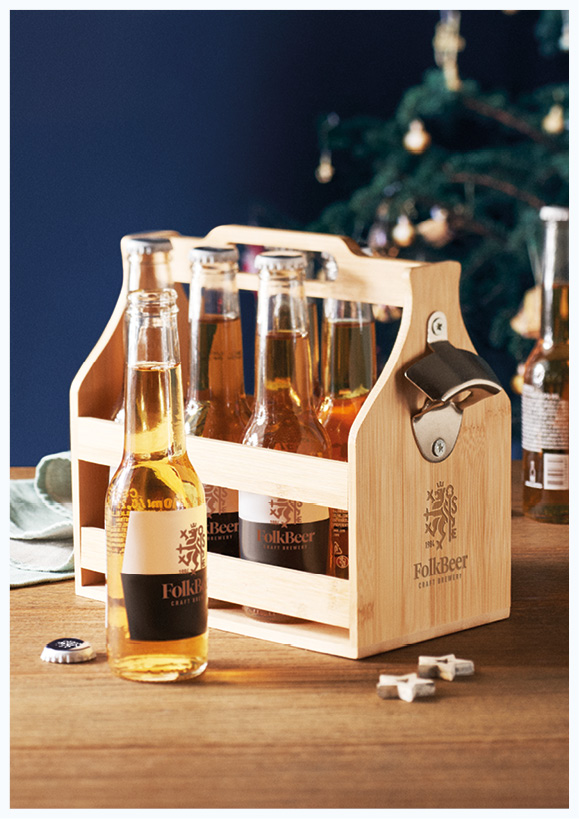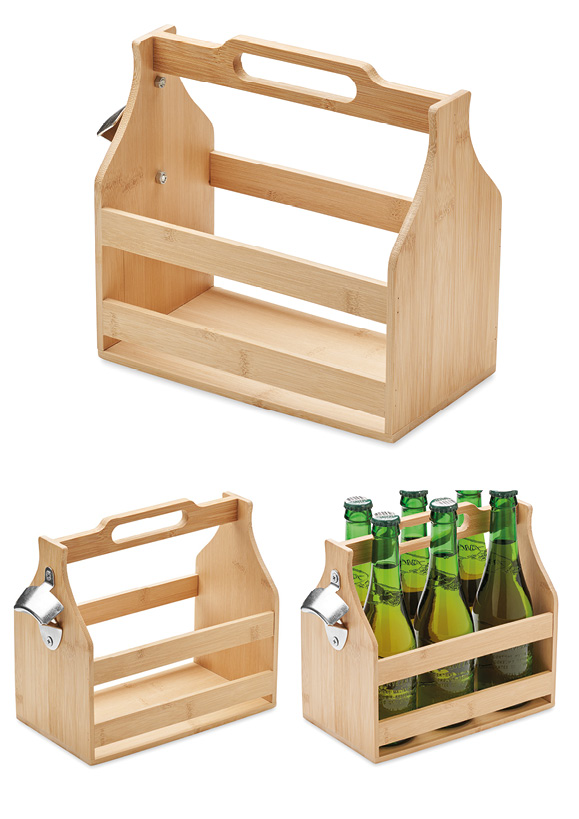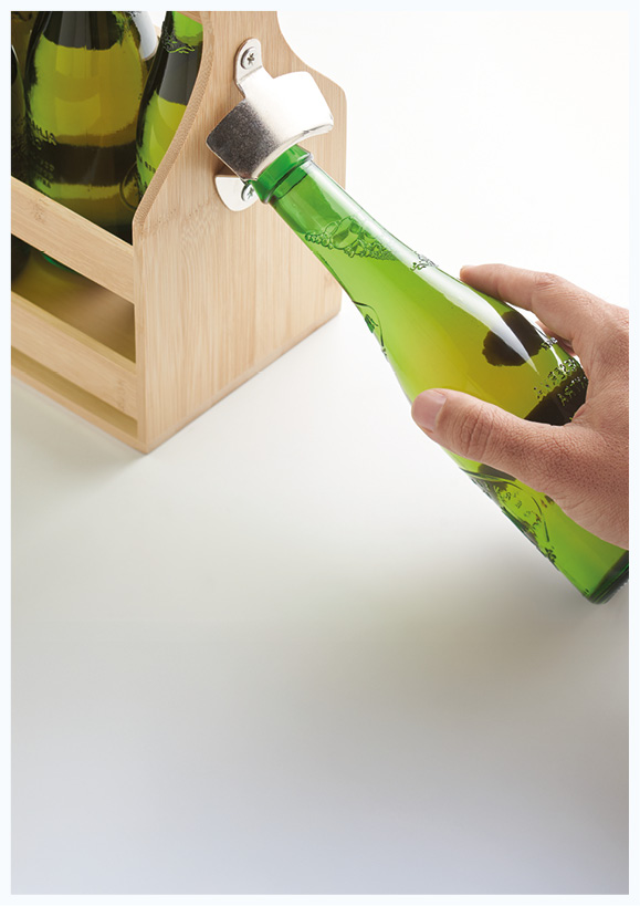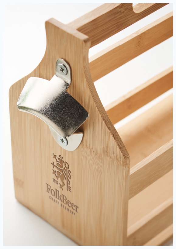 ØLKASSE MED HÅNDTAK OG ÅPNER leveres med mulighet for logo eller dekor på flere plasseringer. Standard dekorasjonsteknikk er lasergravering på begge sider av kassen. Venstre side kan levers med silketrykk i fire farger. Mulighet for gravering på bambus-stenger. Minimumsordre 10 stk.