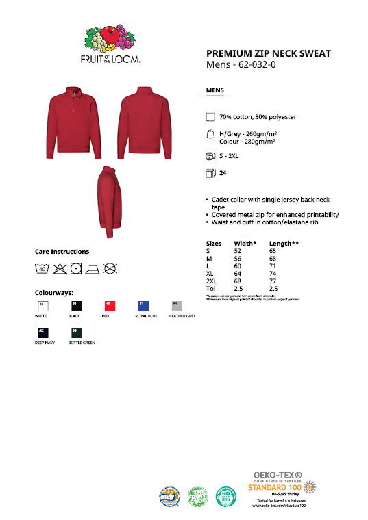 Materiale 70 % kjemmet bomull, 30 % polyester | Vekt 280 g/m² (260 g/m² for hvit og gråmelert) for optimal varme og kvalitet | Passform Unisex med raglanermer og sidesømmer som gir god bevegelsesfrihet | Glidelås Skjult metallglidelås i kvart lengde for stilrent uttrykk og god trykkflate | Krage og mansjetter Cadet-krage og ribbestrikk i bomull/elastan for formstabilitet | Sømmer Doble sømmer i hals og ermer gir ekstra holdbarhet | Overflate Jevnstrikket for høy trykkvalitet og skarp logogjengivelse | Bruksområder Ideell til profilering, firmabekledning, klubbtøy og gaveartikler | Størrelser S til 2XL | Vask Kan vaskes i maskin på opptil 40 °C | Sertifiseringer Oeko-Tex Standard 100 og Amfori BSCI for trygt og ansvarlig valg | Minimumsbestilling 25 stk. | Etikett Avrivbar etikett for enkel rebranding