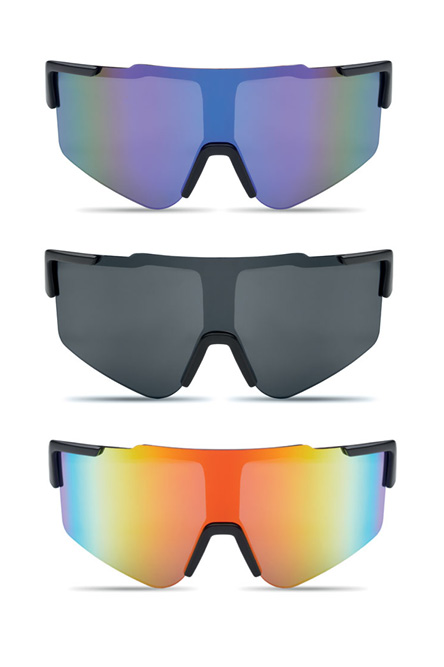 SPORTSBRILLER SHINE er en lett og robust solbrille med speilglass og UV400-beskyttelse. Velg mellom tre speilglass: blå, svart eller multifarget. Den svarte rammen gir et moderne og sporty uttrykk. Disse raske brillene passer perfekt til arrangementer, kampanjer eller som sommergave.