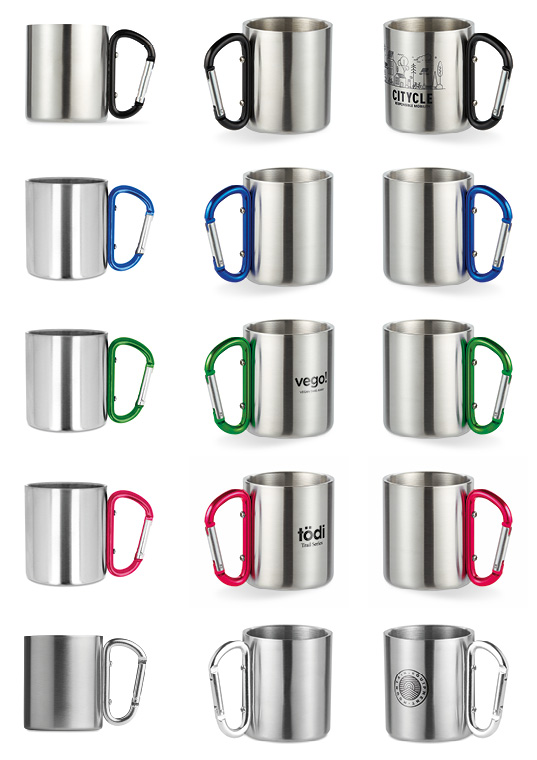 STÅLKOPP MED FARGET KARABINKROK er en slitesterk og lett kopp med doble vegger. Koppen har en praktisk karabinkrok som enkelt festes til sekk eller belte. Den har en kapasitet på 220 ml. Laget i resirkulert rustfritt stål. Doble vegger holder drikken varm lenger og gir et solid kvalitetsinntrykk.