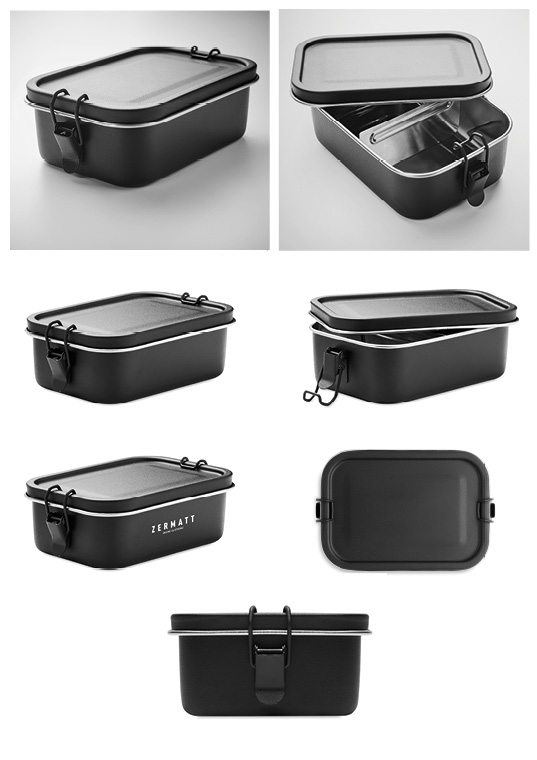 Materiale Rustfritt stål 304 | Kapasitet 750 ml | Dimensjoner 16 x 11,5 x 5,5 cm | Lukking Sterke side-spenner i stål | Skillevegg Avtakbar i rustfritt stål | Overflate Sort lakkert med ståldetaljer | Vedlikehold Tåler oppvaskmaskin | Mikrobølgeovn Ikke egnet | Sertifiseringer Oppfyller EU 1935/2004 og REACH-testresultater | Farge Sort lakkert stål | Kartongkvantitet 30 stk | Logo Lasergravering, tampotrykk, doming, klistremerke | Bruksområde Lunsj, salater, yoghurt, frukt | Egenskap Resirkulerbar