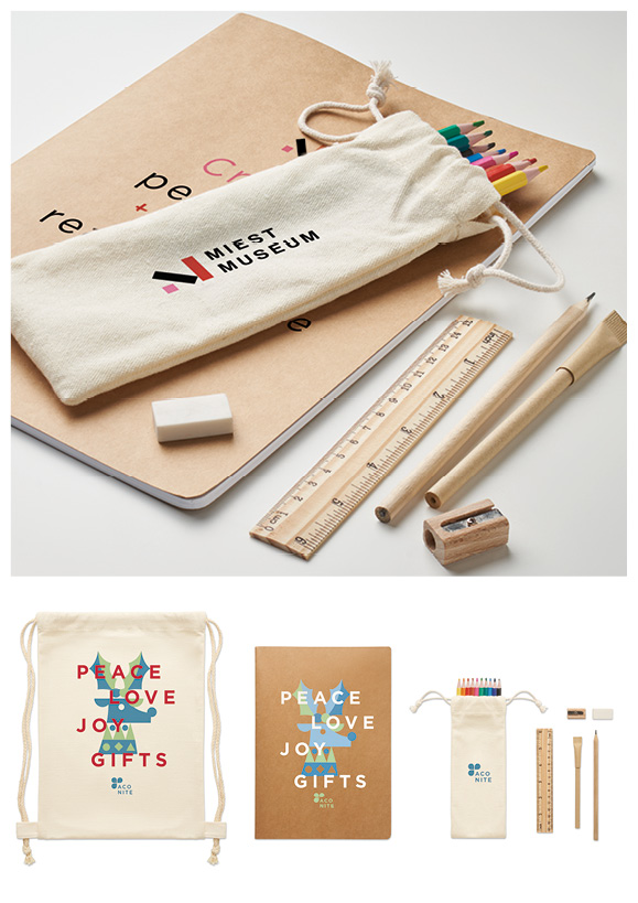 TEGNESETT I GAVEPOSE leveres med silketrykk på pose og tegnebok, samt trykk på penal.